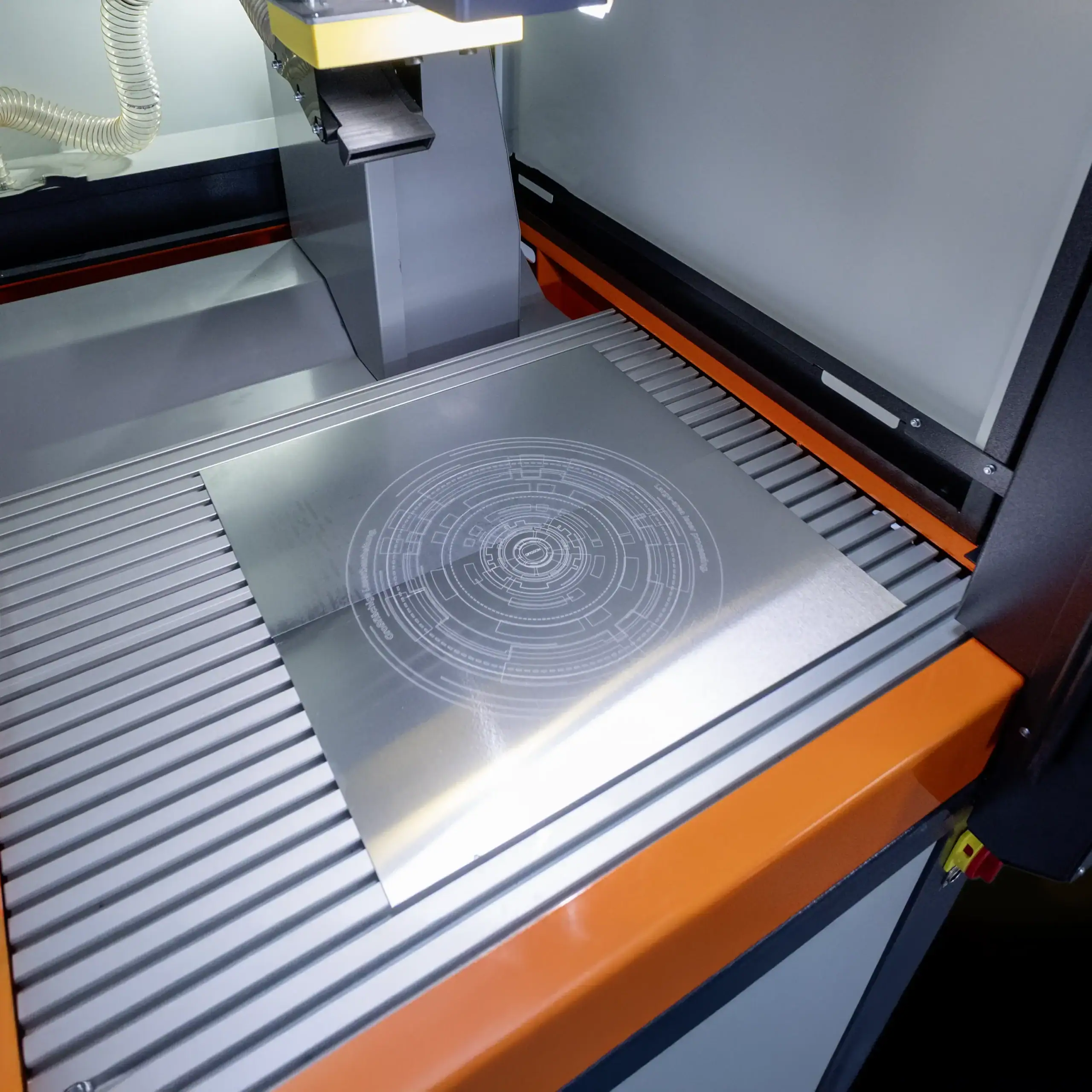 Gravieren, markieren, strukturieren – auf Flächen von bis zu 600 × 600 mm in echten 600 dpi, ganz ohne Segmentierung.
